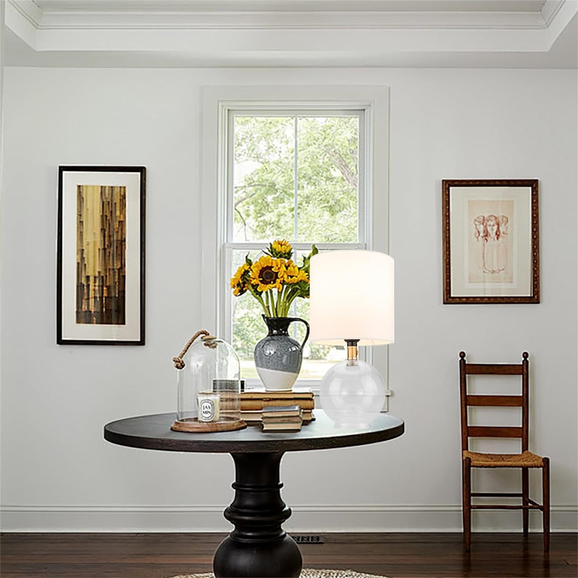 Minimalist Glass Bedside Table Lamp – Cylindric Fabric Shade Nightstand Lamp for Bedroom & Desk